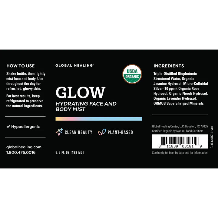 Glow is an organic, aromatic face and body mist that hydrates the skin. It's specifically formulated with botanical plant hydrosols like jasmine and rose to soothe and refresh your skin anytime, anywhere. We've even included botanicals that have aromatherapeutic benefits. Glow goes beyond skin health and helps you feel calm and relaxed. Plus, Glow even has ORMUS Supercharged Minerals to enhance the energetic frequency. Use Glow on a bare face, after makeup, or to re-hydrate mid-day. Great for all skin types and hypoallergenic!