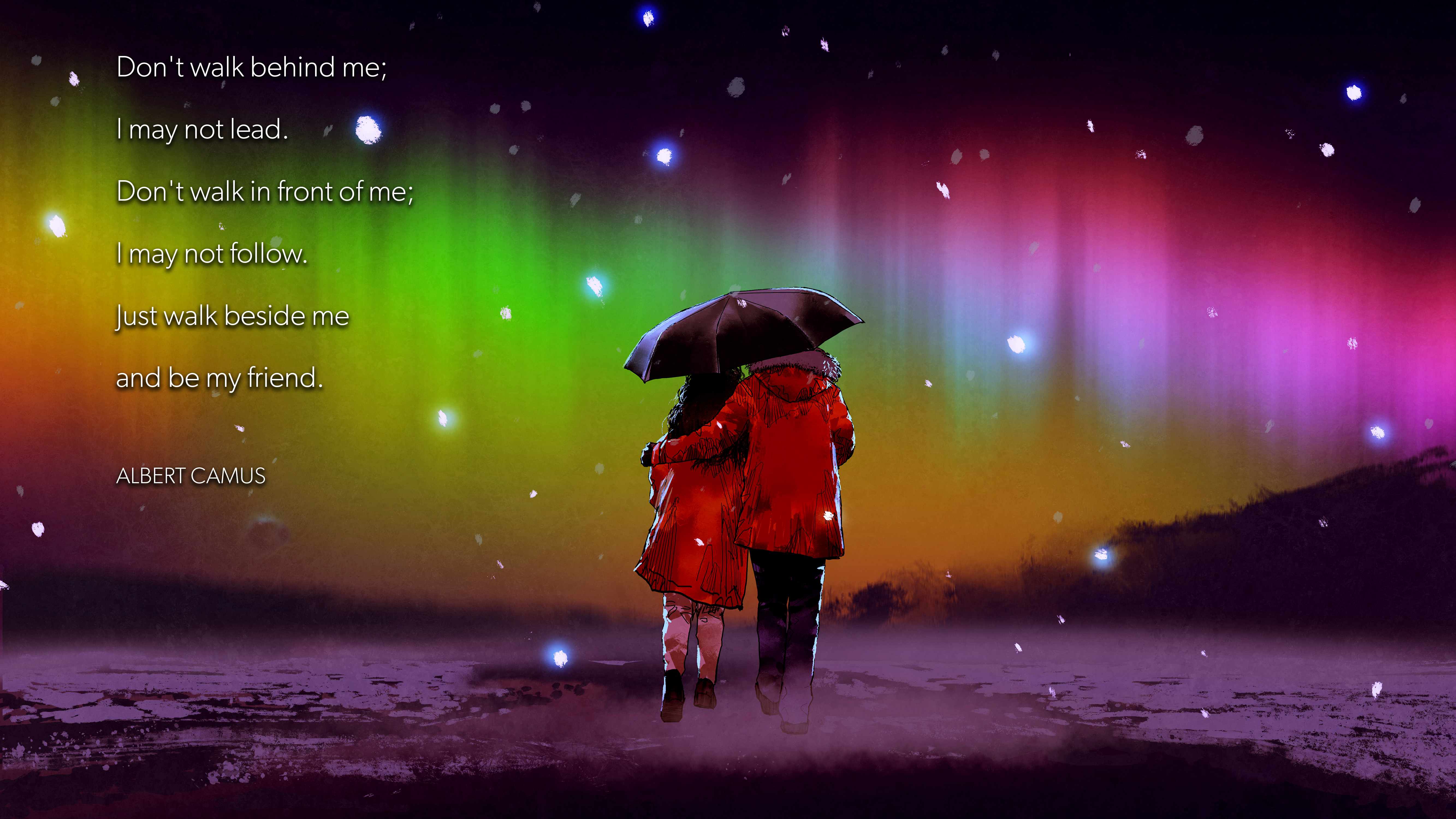 Don't walk behind me; I may not lead. Don't walk in front of me; I may not follow. Just walk beside me, and be my friend. - Albert Camus