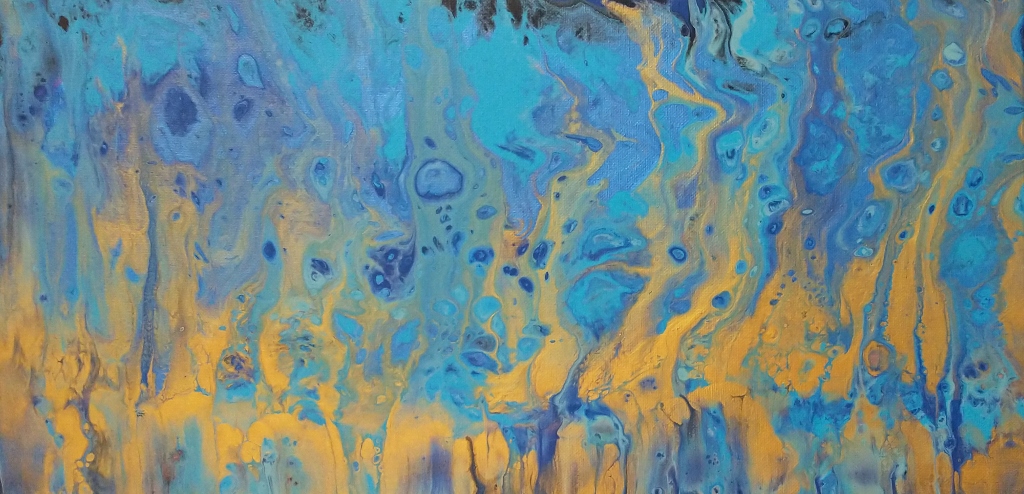 The colors used in this painting are Blue, Turquoise, Metallic Gold, and Black