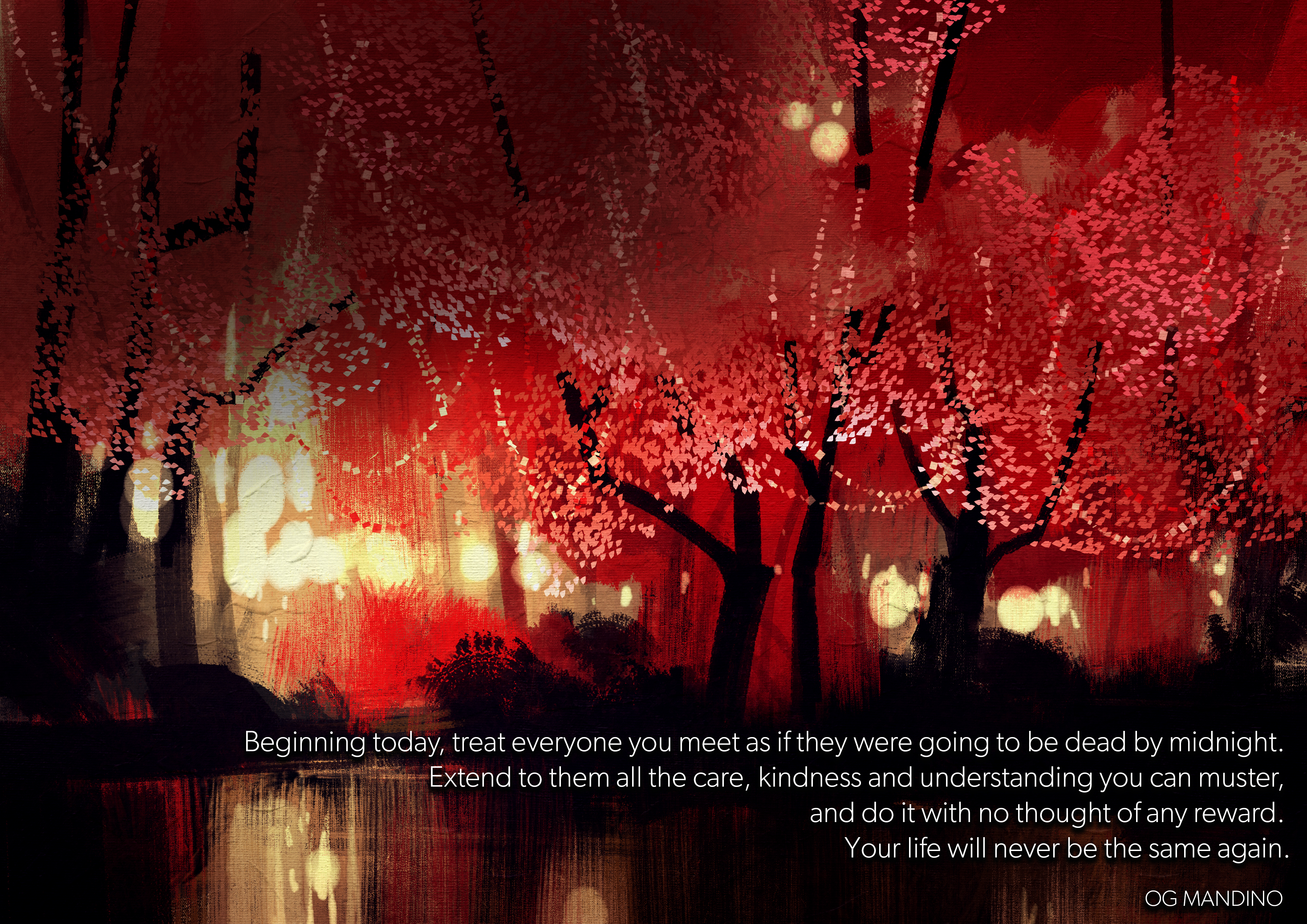 Beginning today, treat everyone you meet as if they were going to be dead by midnight. Extend to them all the care, kindness and understanding you can muster, and o it with no thought of any reward. Your life will never be the same again. -O. G. Mandino