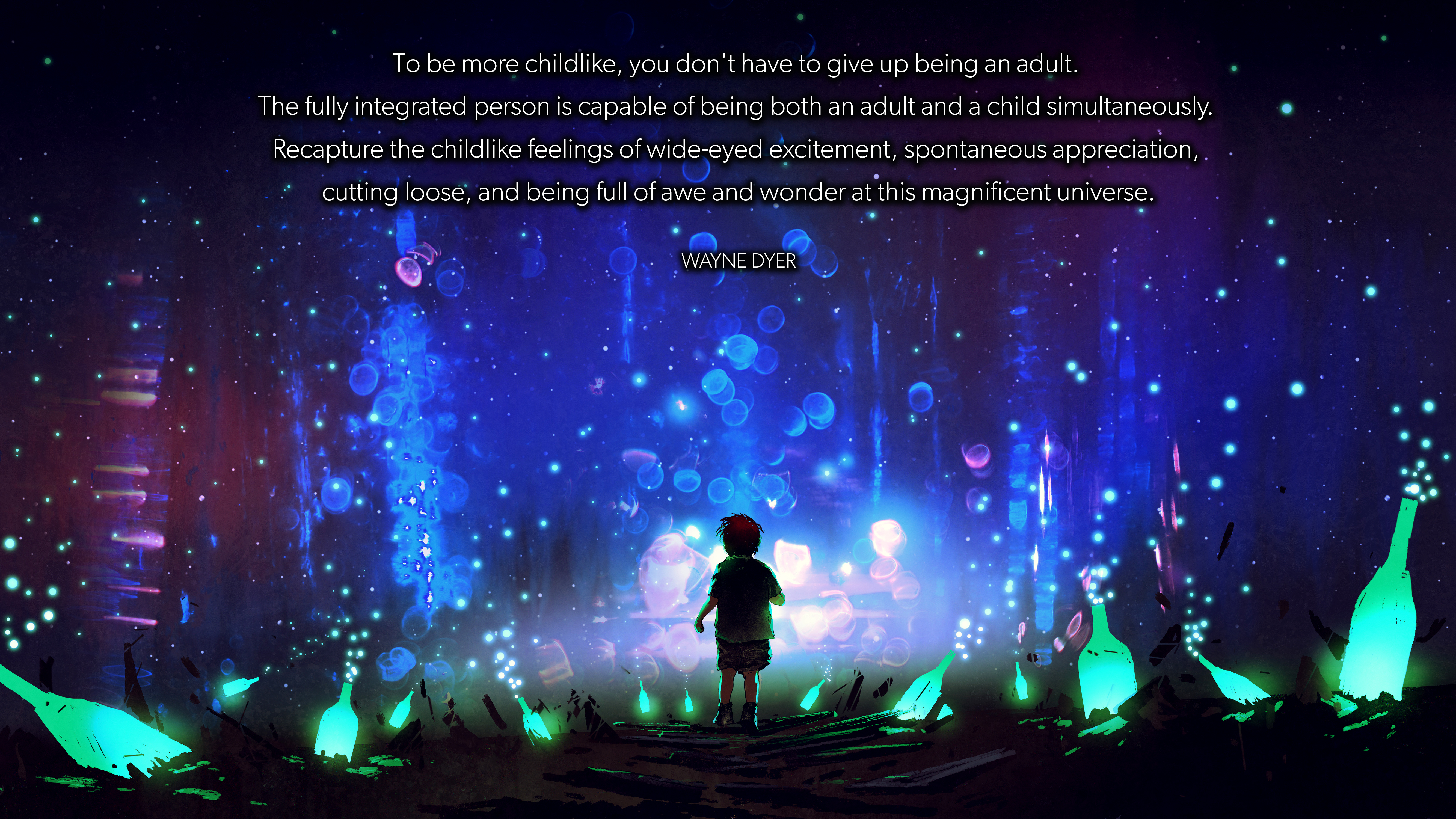 To be more childlike, you don't have to give up being an adult. The fully integrated person is capable of being both an adult and a child simultaneously. Recapturing the childlike feelings of wide-eyed excitement, spontaneous appreciation, cutting loose, and being full of awe and wonder at this magnificent universe. - Wayne Dyer