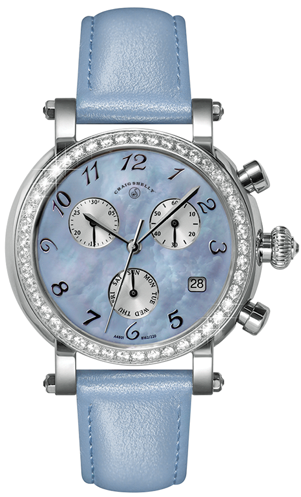 A4801 Ladies, Swiss chronograph, 10 ATM, Swarovski crystal accents (45 prong set crystals), Stainless steel case, Genuine leather strap, Genuine mother-of-pearl dial, Genuine sapphire crystal, 30 minute register and 1/10 second counter, Case diameter: 36mm