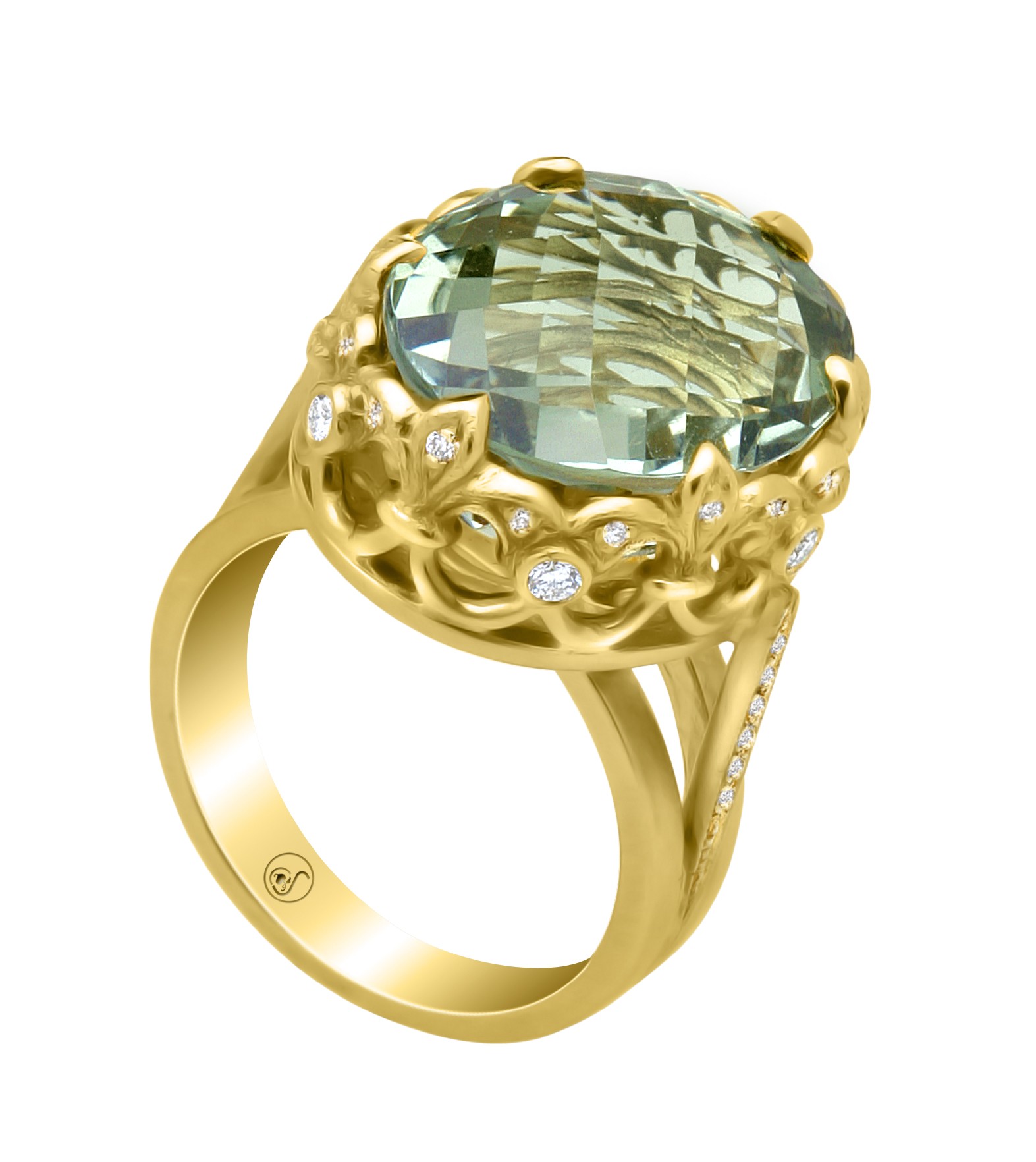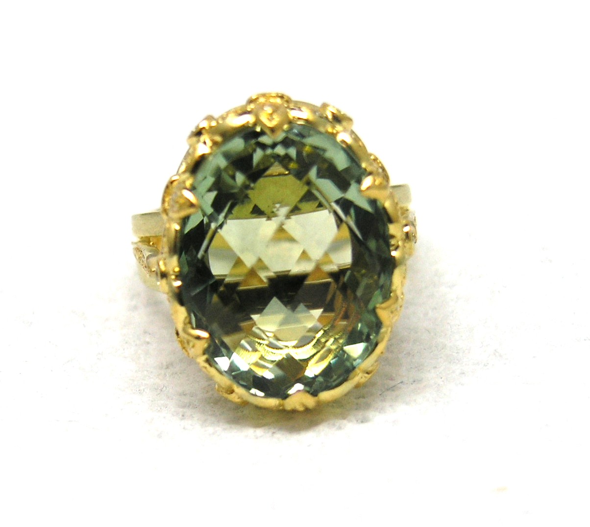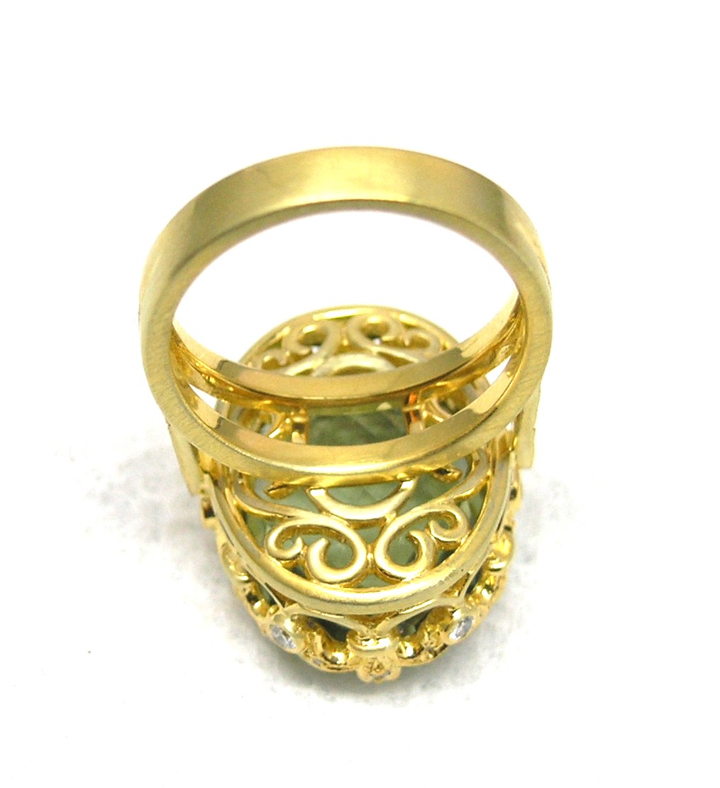 Designer fashion ring. Princess Crown set with Green Amethyst in center and G VS Diamonds on the side.