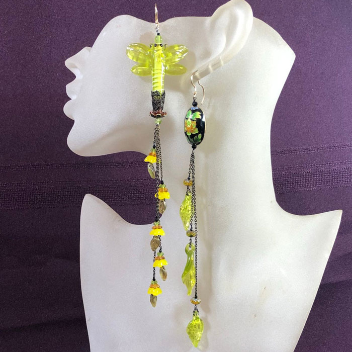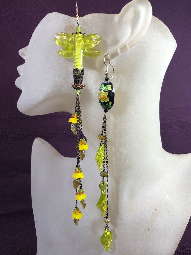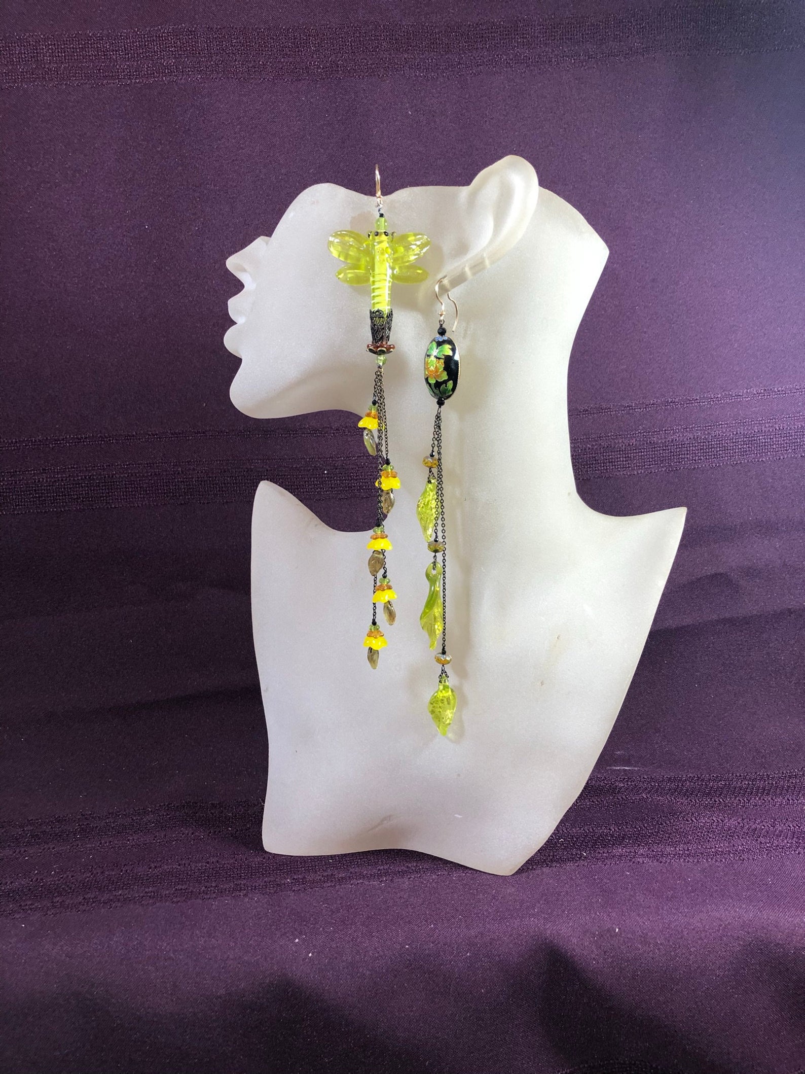 Asymmetrical, Dragonfly, Flowers, Nature, Chartreuse, Yellow, Glass, mismatched, Dangly, Long, Drop earrings.