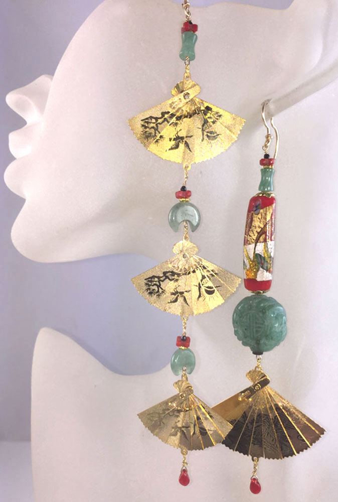 Three tiny and one medium fan (they actually open and close to suit the width you prefer) form this statement-maker. Green aventurine and tiny red 4-pointed beads unite the complex earring with the lovely multicolored bead on the other. The tiny 4-points are antiques, harvested in Africa after having been made for trading in the old Czechoslovakia. They are 5½ and 6½ inches long and one is light in weight and the other medium; for comfort they could be switched during a wearing.