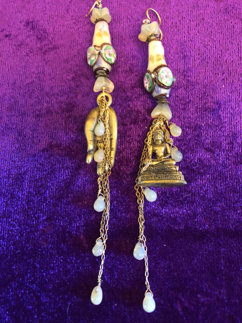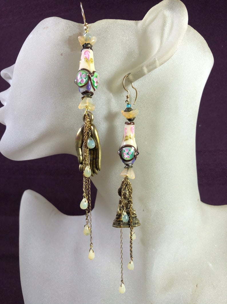 Spiritual, Buddha, Hand of Buddha, Asymmetric, Mismatched, Long, Asian, Ethnic, Statement, Yellow, Aqua, Pink, Earrings.