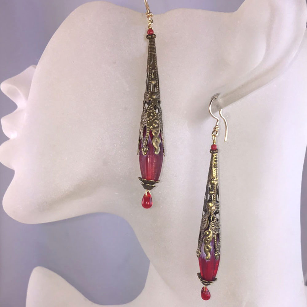 Every piece of jewelry in the Earring Addict Gallery is a unique, one-of-a-kind sculpture made of exotic treasures, beads, and artifacts. They are designed by highly-awarded, Marise Cherin, whose unique jewelry innovations have adorned stage, film and television projects, including use in the first episode of Star Trek: The Next Generation.