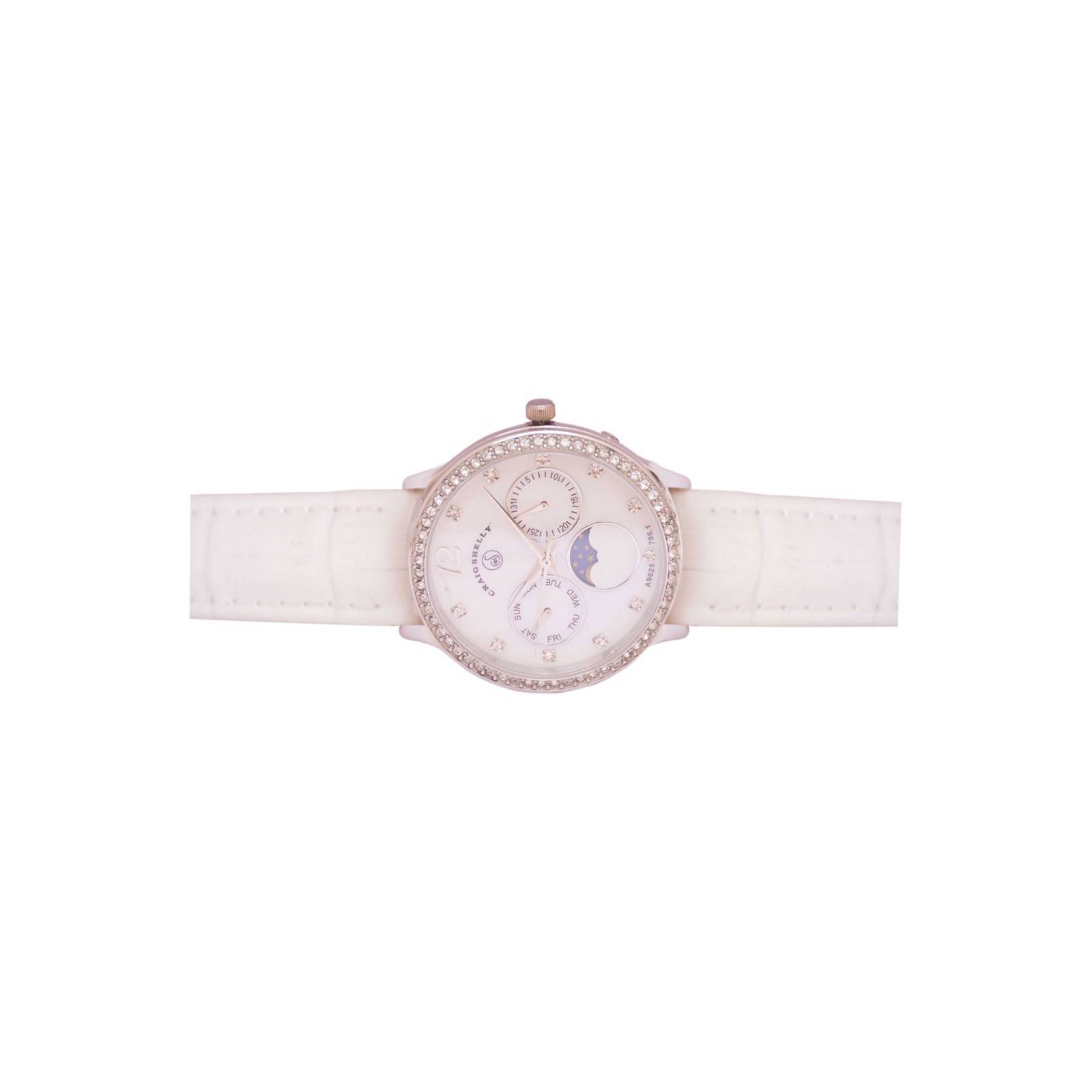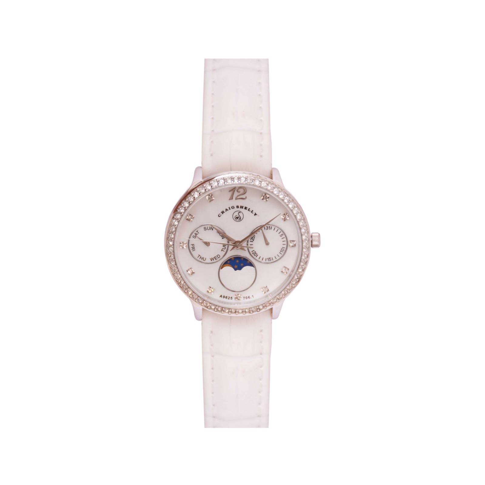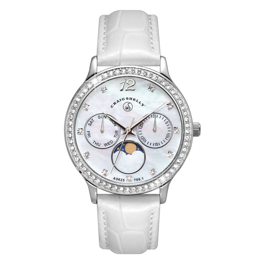 The Porcelaine embodies harmonious parts to create a clean and glistening aesthetic. Building on its stainless steel case and white leather strap, the Porcelaine has a mother-of-pearl dial and a moonphase multi-function. A sprinkle of Swarovsky cyrstal accents decorate this timepiece for a luminous finish.