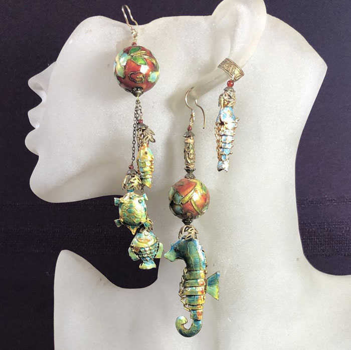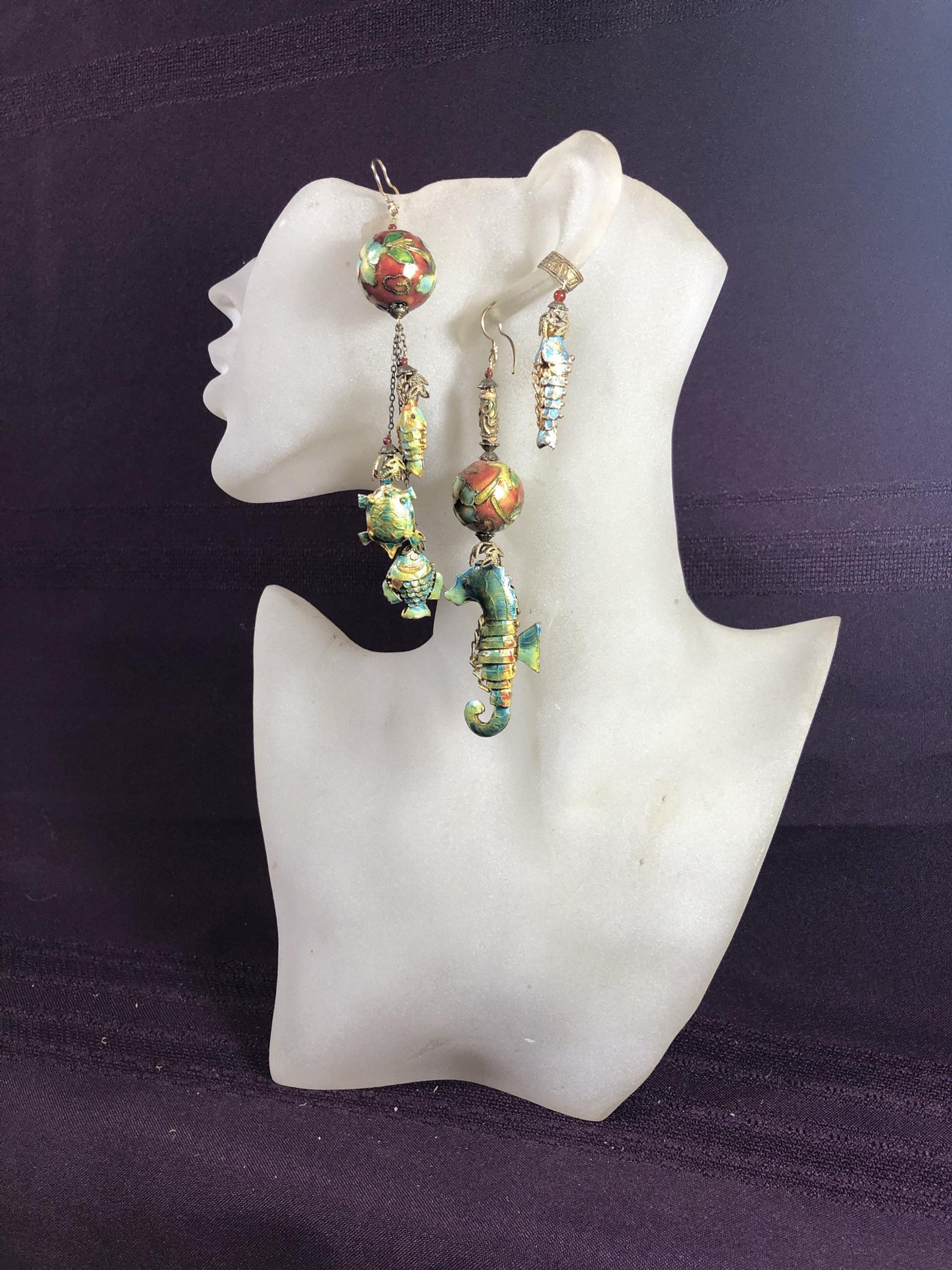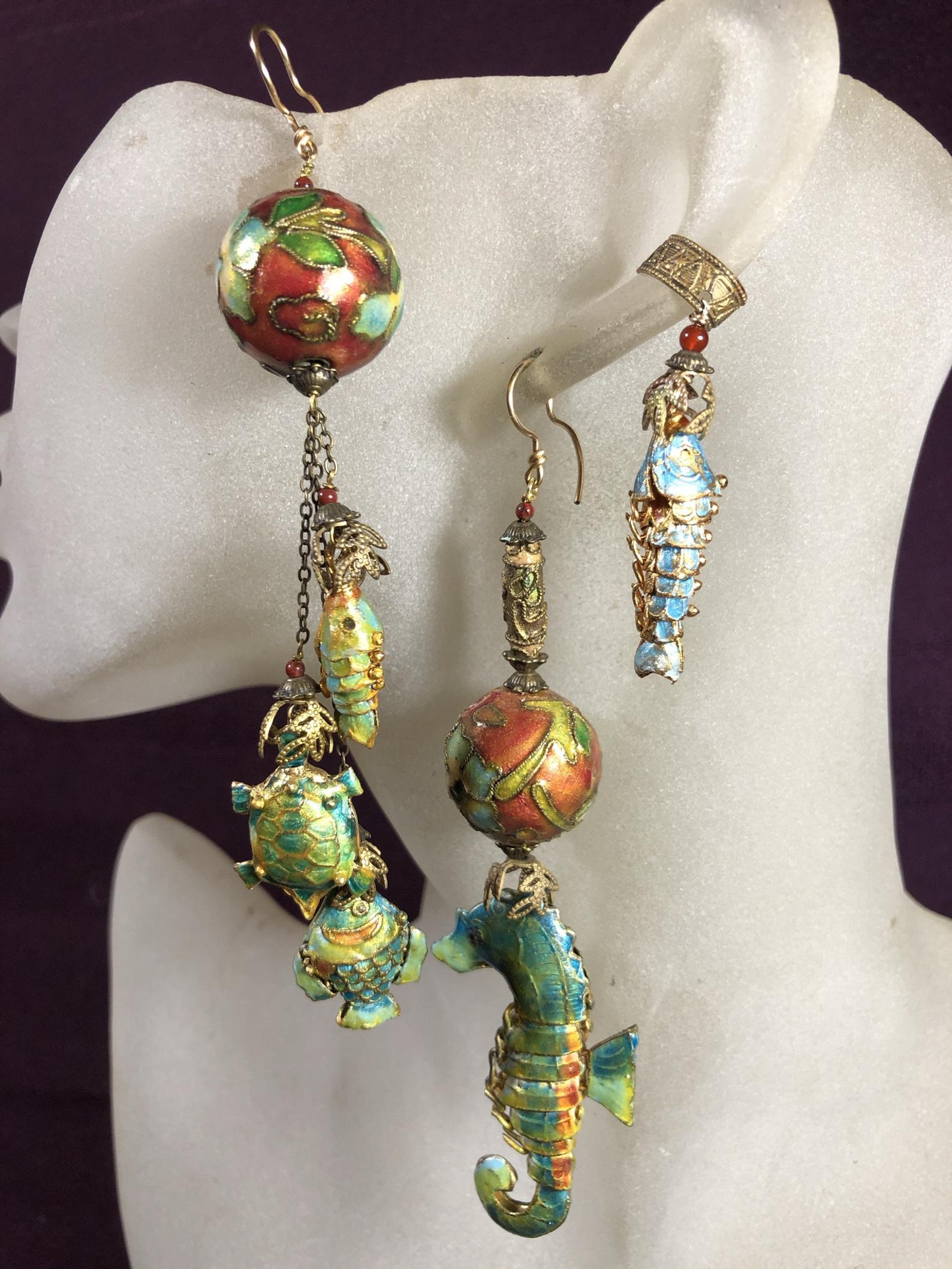 Set/3, Enamel earrings, Seahorse, Fish, Ear cuff, Asymmetrical, Mismatched, Long, Dangly, Drop, Aqua/Russet, Avant Garde, Statement.