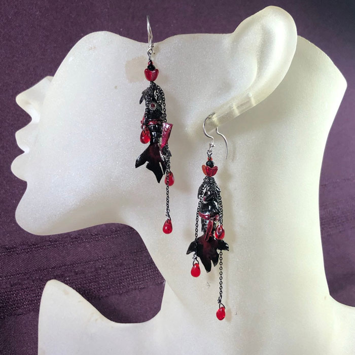 Small fish, Red, Black, Fantail, Enamel, glass drops, Light weight, Long, Dangly, Drop earrings, Sterling ear wires