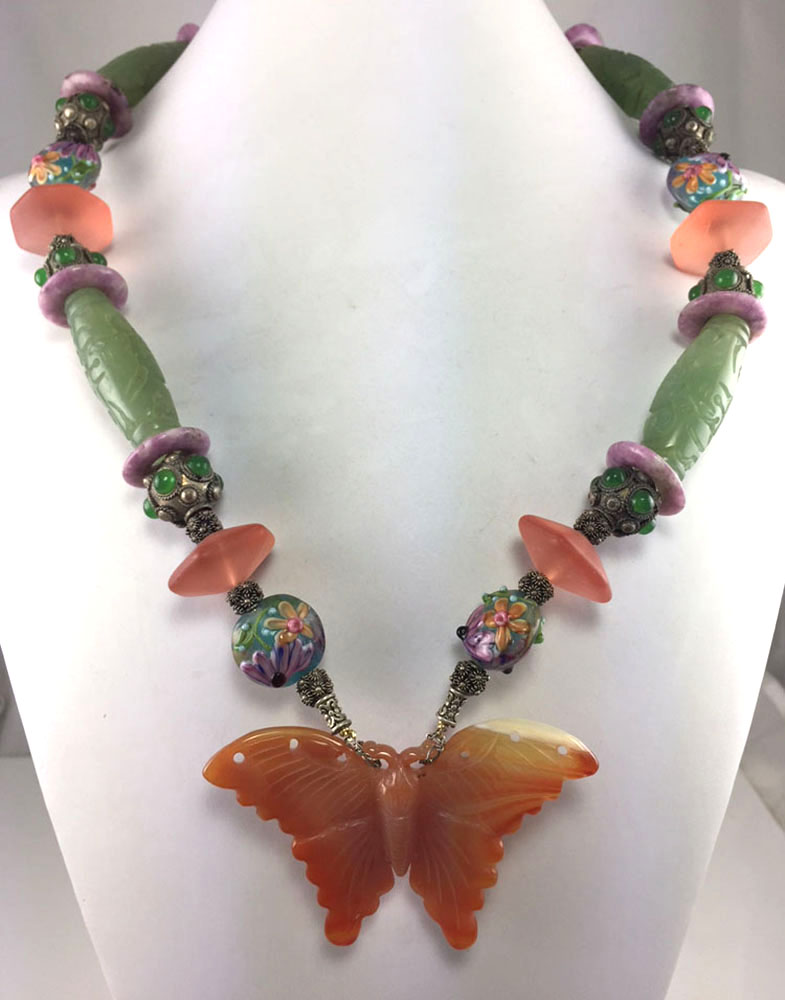 A Spring garden of carnelian, glass, jades, and a silver dragonfly clasp. Medium-heavy weight.