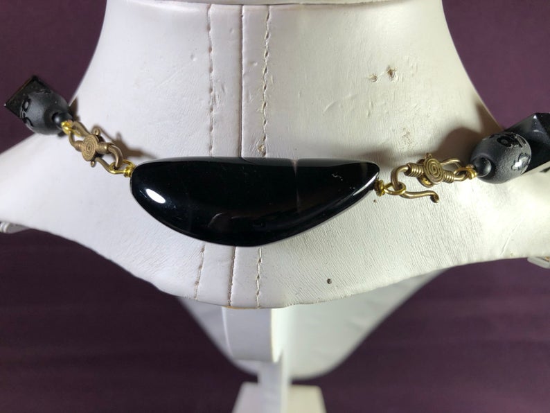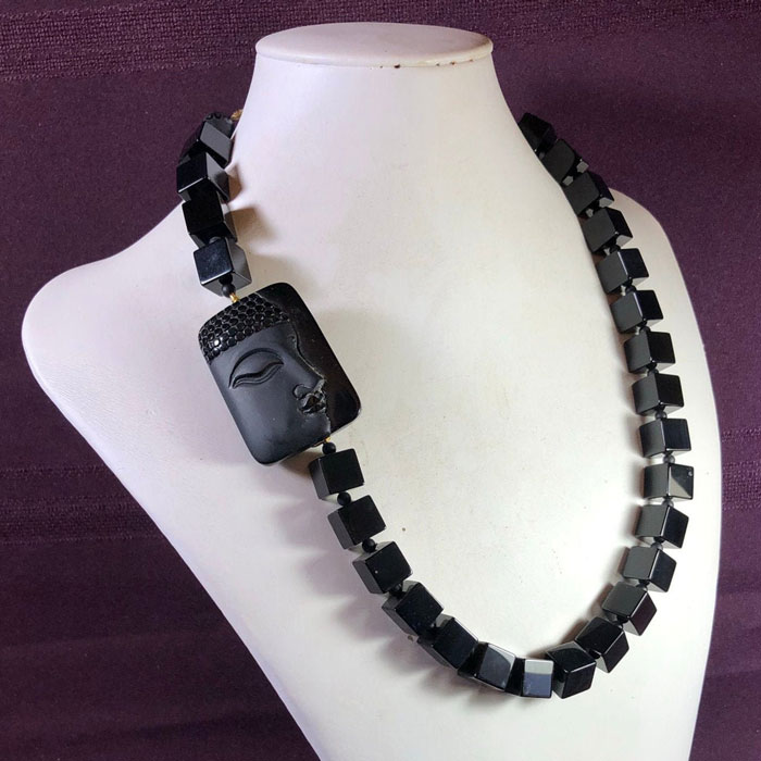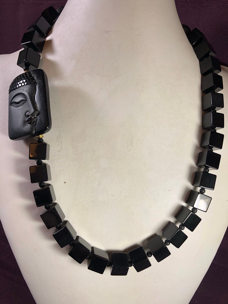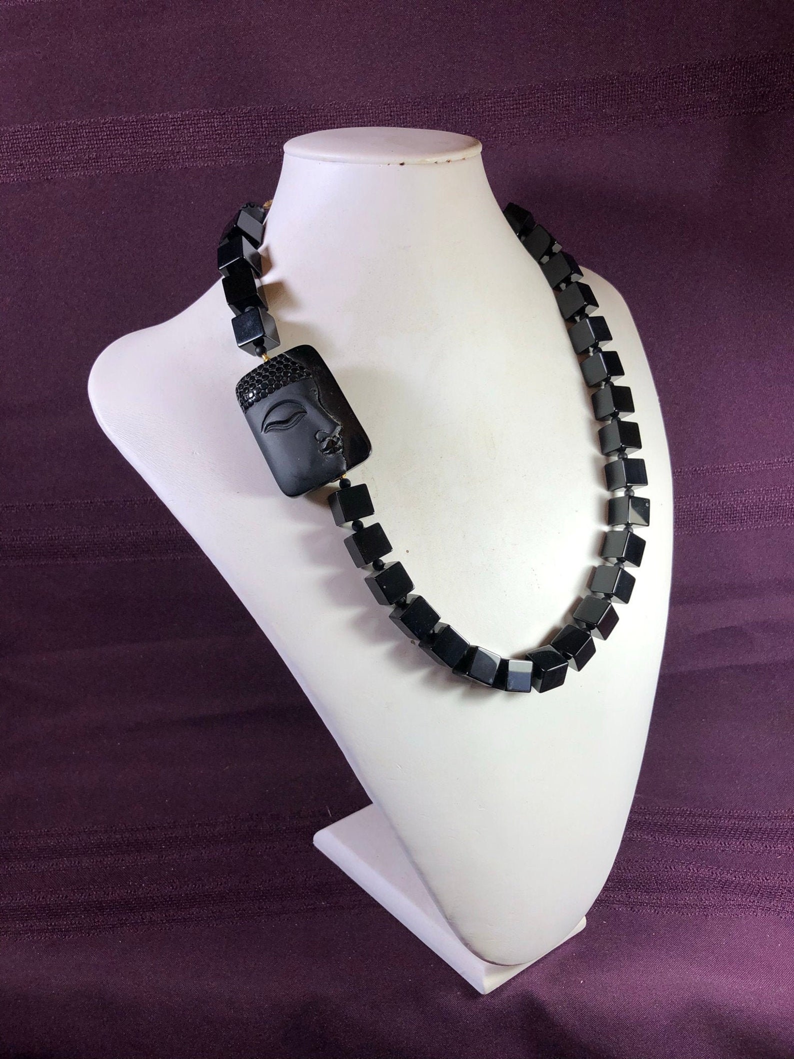 Stylized Buddha, Black Onyx, Necklace, Cube Beads, Two Lengths, Asian, Spiritual,, Ethnic, Symbolic, Dramatic