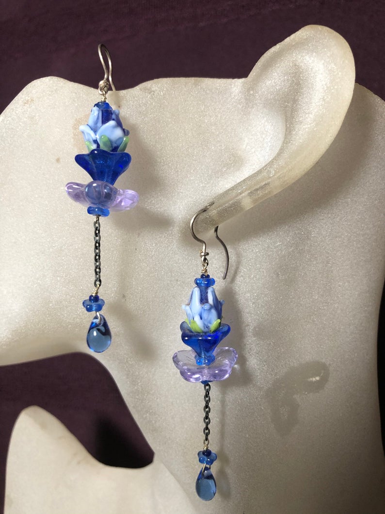 Blue/Lavender, Graceful, Flowers, Glass, Light Weight, Sterling Ear Wires, Long, Dangly, Drop Earrings