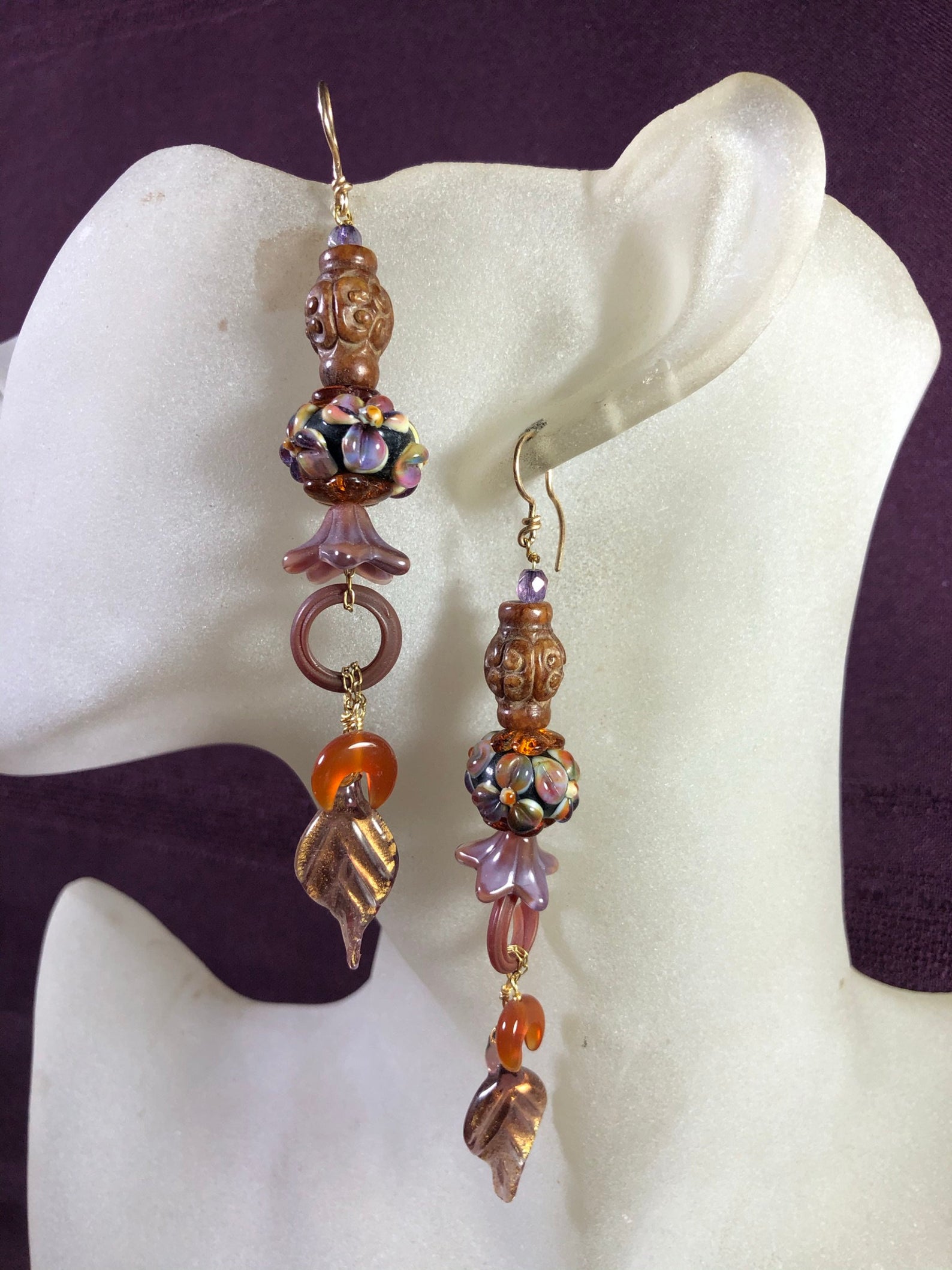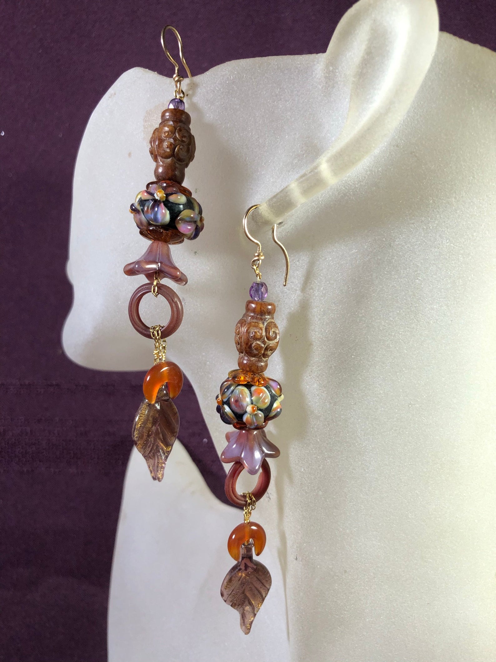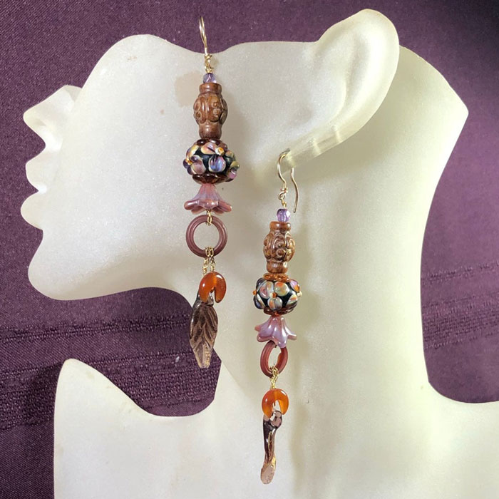 Redhead's Delight! A study in russets with touches of lavender. Easy to wear, light weight, of carved jasper , art-glass, and carnelian.