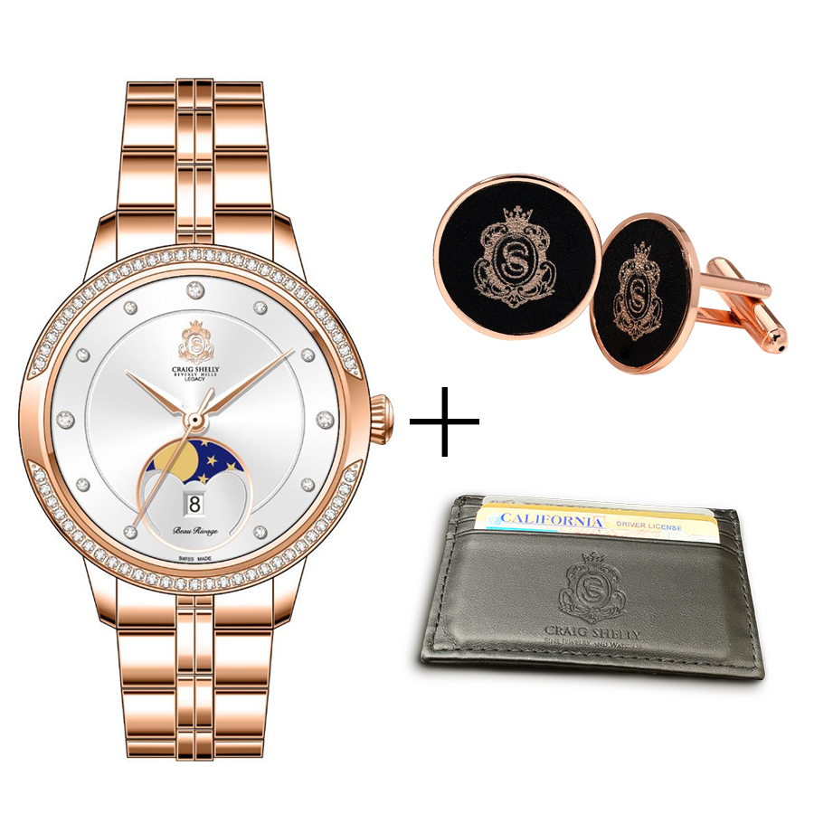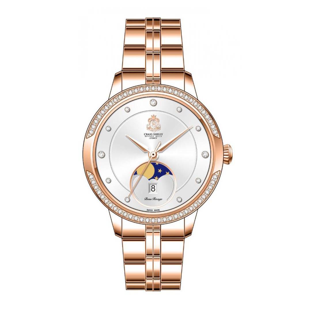 Inspired by the beautiful river shore in Switzerland, this timepiece is intricately designed and crafted for an elegantly romantic woman! The Moon-phase date movement and pavé set crystals capture beauty of a starry night!