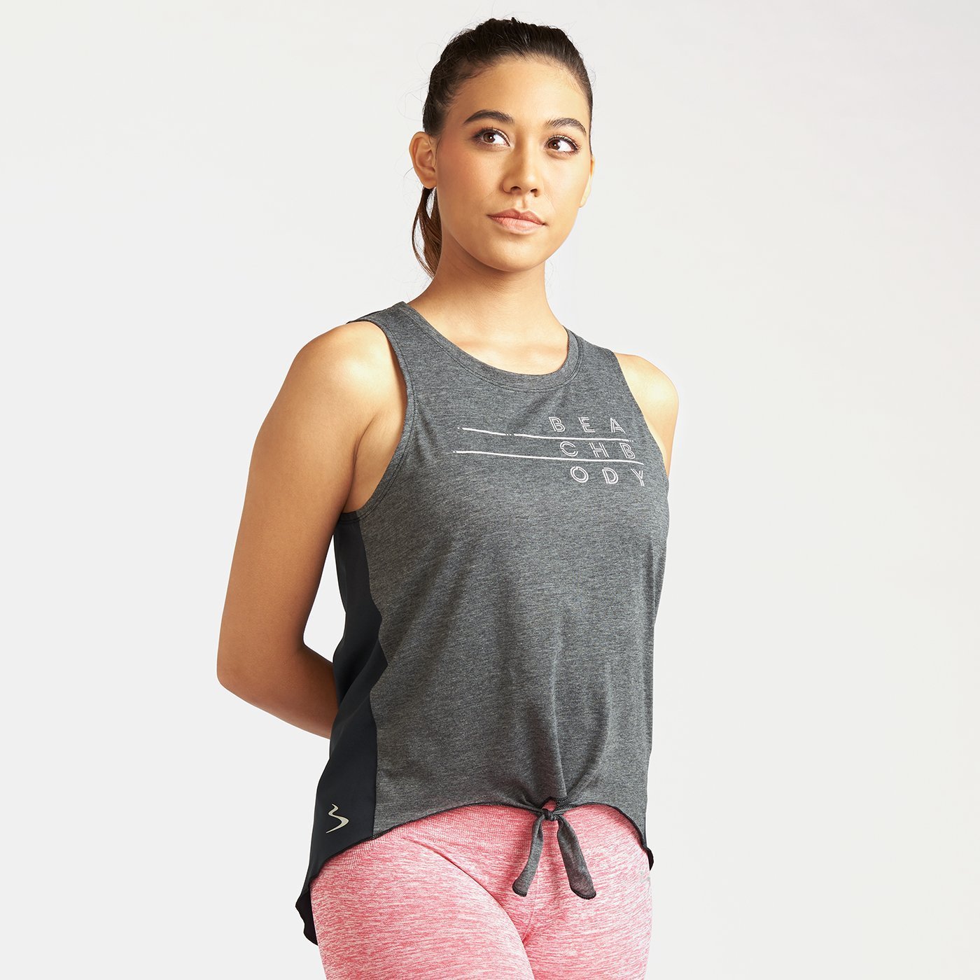 Show off your style and layer up with our Tied Up GFX tank, crafted with DRY-TEK® wicking yarn technology to help keep you cool, dry and comfortable. Special Features Novel fabric mix Tie front detail Soft, lightweight layering Exclusive Beachbody® graphic Fit Regular fit Models are featured in Size S.