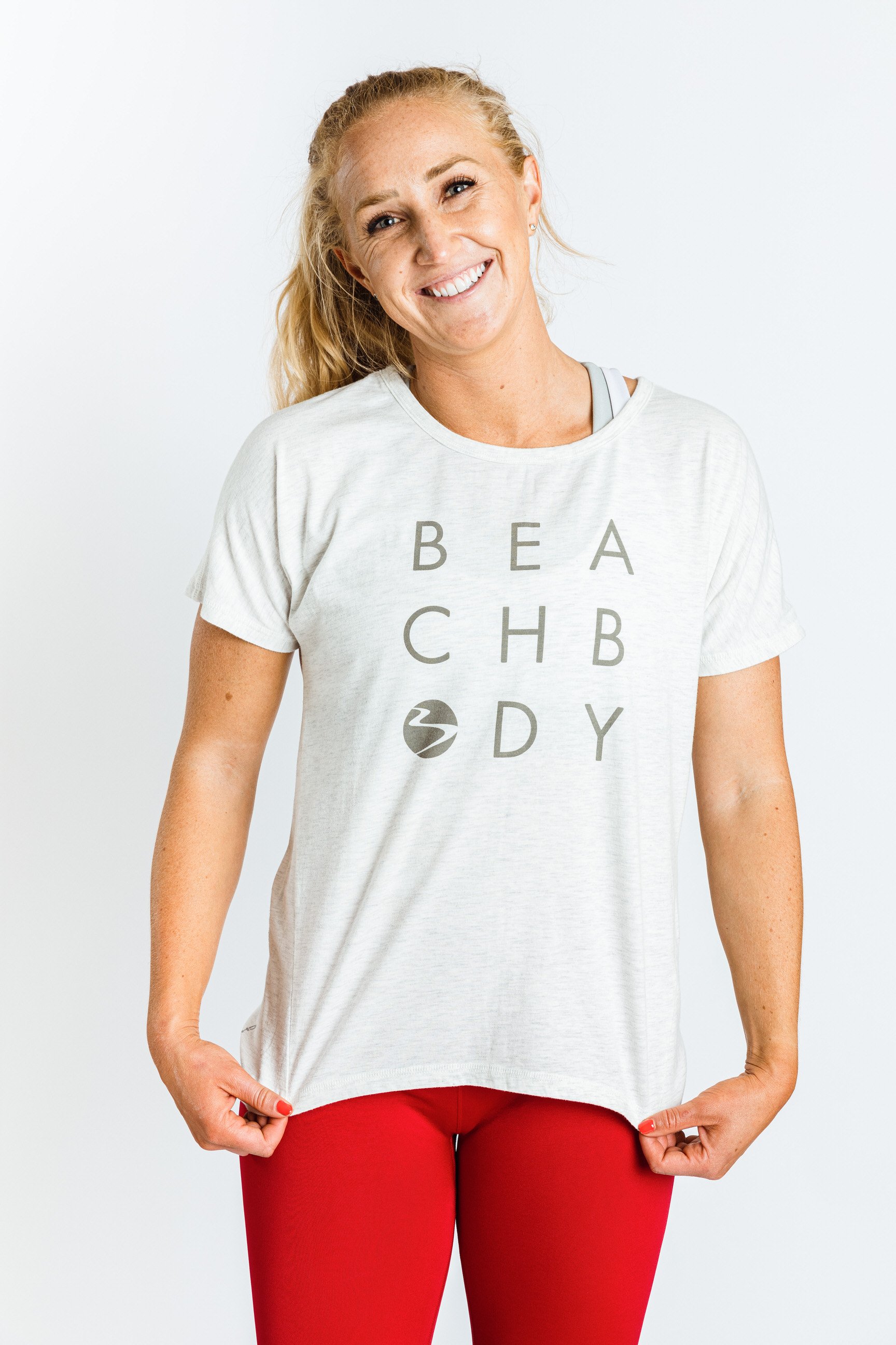 Comfort comes first in this soft and lightweight graphic tee that keeps you cool with its relaxed fit and peek-a-boo detail, so you can work out or chill out in style Made with DRY-TEK® fabric to keep you cool and dry Garment washed for soft, lightweight layering Novel back peek-a-boo detail for cooling Exclusive Beachbody graphic Fit Relaxed fit